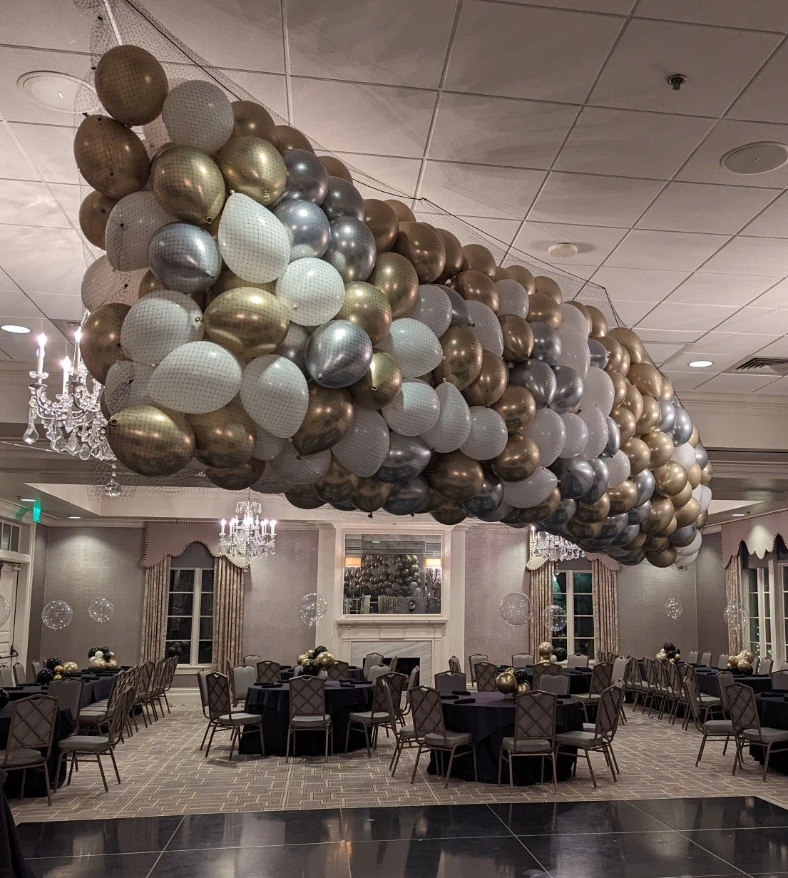 Elegant Chrome Balloon Drop At Ansley Golf Club In Atlanta - Silver, Gold, And White